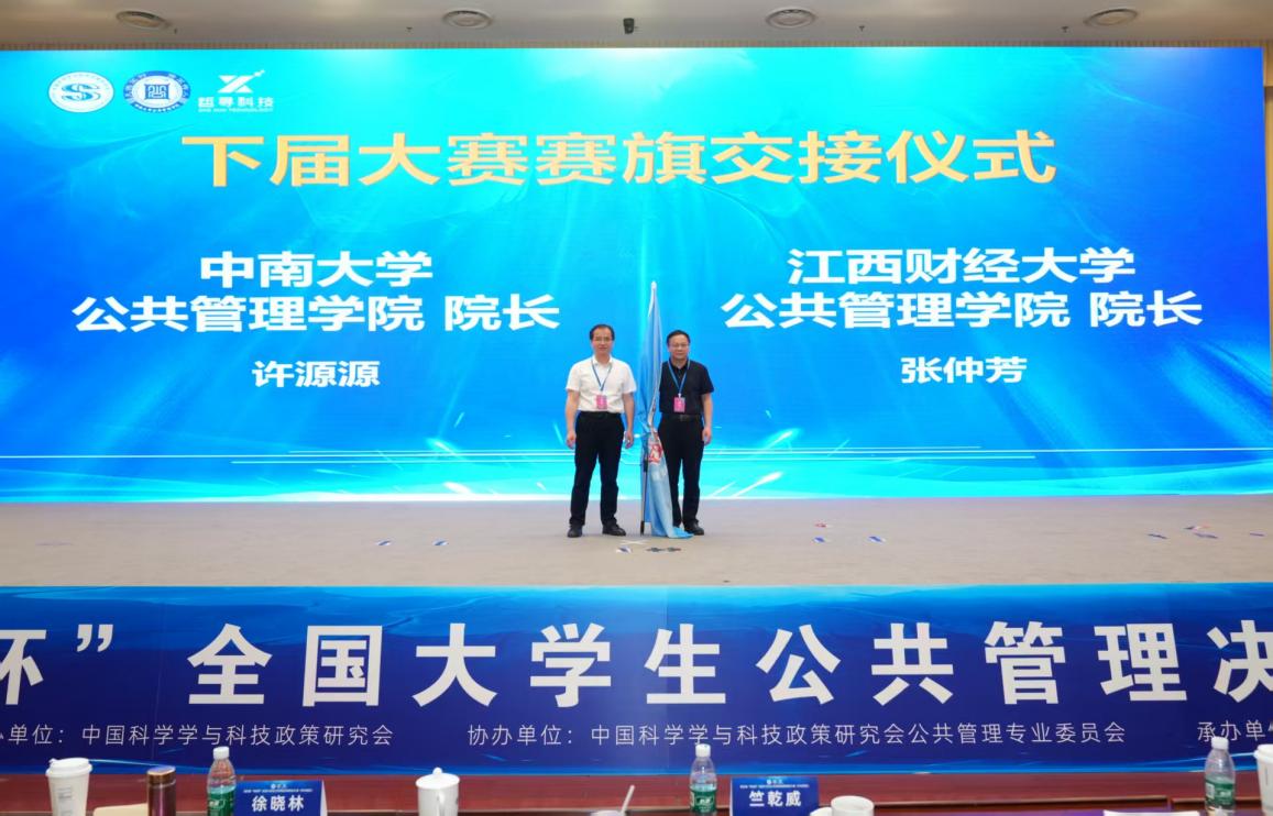 值得期待的是,在此次大赛闭幕式上,我院作为2026年华中赛区的承办方与中南大学亚洲性爱视频 进行了赛旗交接。在闭幕式上,由中南大学亚洲性爱视频 院长许源源将“寻是杯”赛旗挥舞着交给了亚洲性爱视频 院长张仲芳,张仲芳院长在发言中亲切表达了对赛事的高度重视、对本次比赛成功举办的由衷祝贺,以及对我院承办2026年华中赛区赛事的坚定信心。让我们共同期待2026年第五届"寻是杯"全国大学生公共管理决策模拟大赛(华中赛区)在我校顺利举办!
